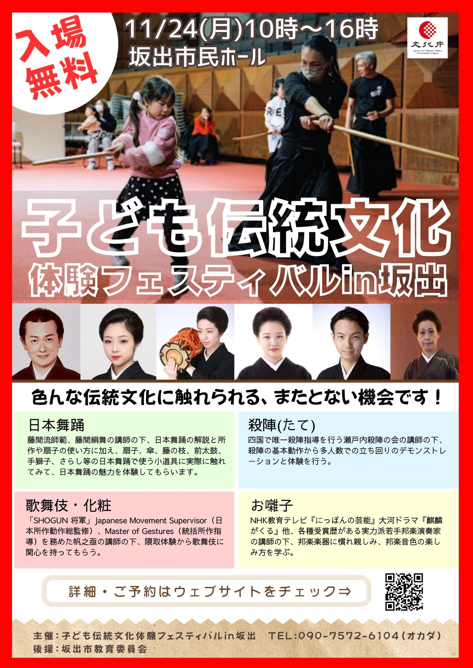 会場内に、①日本舞踊/瀬戸大橋音頭(日本舞踊、祭り行事)②殺陣 ③ 歌舞伎・化粧(礼法)④お囃子(邦楽)の4つのエリアを設け、1日に複数回体験機会を設けることで、気軽に伝統文化にふれられる機会を提供します。